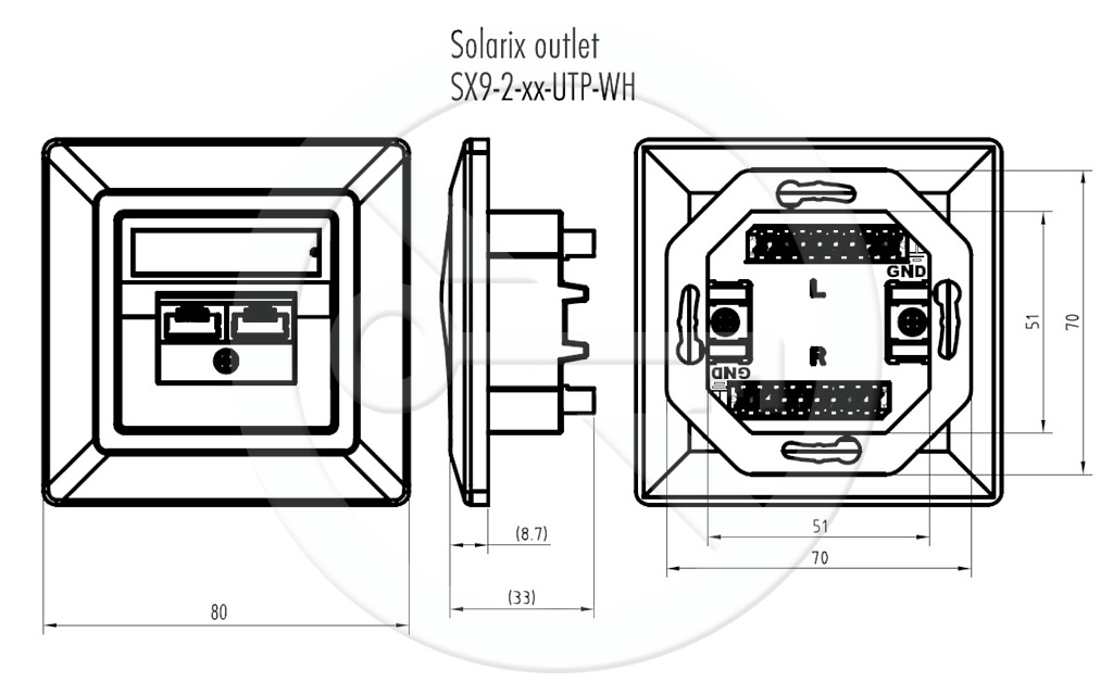 The SX9 outlets from the Solarix product group – Category 6 easily meet all requirements defined in the ANSI/TIA 568, ISO/IEC 11801, and EN 50173 standards for structured cabling for Category 6 and Class E, including all the latest amendments. The outlets are German style and are equipped with one or two RJ45 ports with a 45° angle. AWG 26–22 wire-type conductors can be cut into the Krone-type IDC terminal block. The contacts are marked on the terminal block with a color scheme according to the type of connection, either according to the T568A or T568B standard. SX9 outlets are designed to provide maximum performance, long life, reliability, and easy installation. The outlets are available in both unshielded and shielded versions and are designed for flush mounting or installation in window sill channels. When using the SX9-0-WH box, this type of outlet can be used for surface mount installation. The color of the outlet and box is white (RAL 9003).