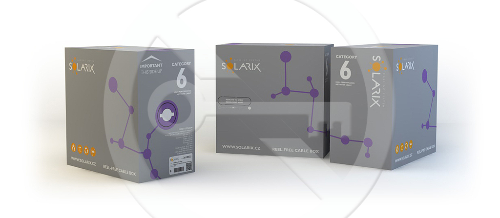 website. In the case of CPR (EU Regulation No. 305/2011), the cable is tested in the AVCP 3 property assessment system. Like other Solarix cables, the SXKD-6-UTP-LSOH cable is marked in 1 m increments from 0 to 305 m. The cable is supplied in a highly durable three-layer polished cardboard box, which contains all the necessary product information, including barcodes, production batch, description, and the most important technical parameters.
