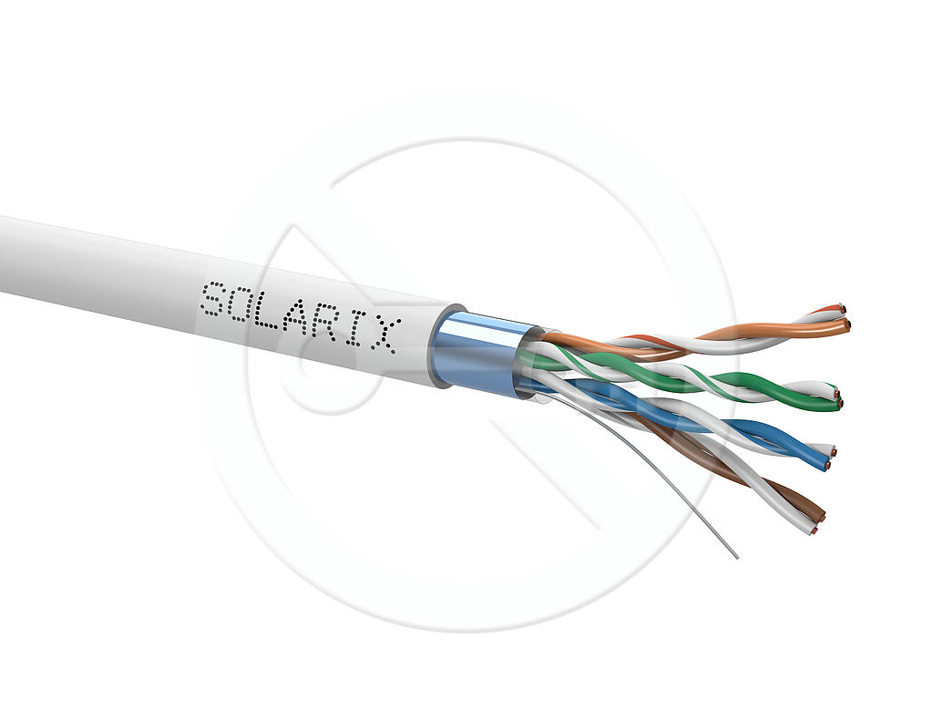 The Solarix SXKD-5E-FTP-PVC installation cable is a reliable Category 5E shielded cable designed for Ethernet protocols, including 2.5GBASE-T and 5GBASE-T*. The cable construction is F/UTP, PVC jacket type with Eca reaction to fire class. The cable conductors are made of high-quality copper wire with a copper purity of 99.97%. The cable easily meets the requirements of international standards ISO/IEC 11801, EN 50173, and ANSI/TIA 568.2-D. The performance parameters of this cable have been tested by the independent testing laboratory FORCE TECHNOLOGY as part of the EC Verified program, at the highest level, known as Component Level. The certificate is available here on the website under the "Downloads" tab or directly on the FORCE laboratory website. In the case of CPR (EU Regulation No. 305/2011), the cable is tested by the independent FORCE TECHNOLOGY laboratory in the AVCP 3 property assessment system. Like other Solarix cables, the SXKD-5E-FTP-PVC cable is marked in 1 m increments from 0 to 500 m. The cable is supplied on a high-strength wooden reel, which contains all the necessary product information, including barcodes, production batch, description, and the most important technical parameters.
