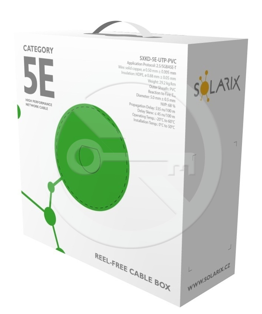 ATTENTION, new 100-meter box. The Solarix SXKD-5E-UTP-PVC installation cable is a reliable unshielded Category 5E cable designed for Ethernet protocols, including 2.5GBASE-T and 5GBASE-T*. The cable construction is U/UTP, PVC jacket type with Eca reaction to fire class. The cable conductors are made of high-quality copper wire with a copper purity of 99.97%. The cable easily meets the requirements of international standards ISO/IEC 11801, EN 50173, and ANSI/TIA 568.2-D. In accordance with CPR (EU Regulation No. 305/2011), the cable is tested by the independent laboratory FORCE TECHNOLOGY in the AVCP 3 property assessment system. Like other Solarix cables, the SXKD-5E-UTP-PVC cable is marked in 1 m increments from 0 to 100 m. The cable is supplied in a highly durable three-layer polished cardboard box (always color-coded according to cable type), which contains all the necessary product information, including barcodes, production batch, description, and the most important technical parameters.