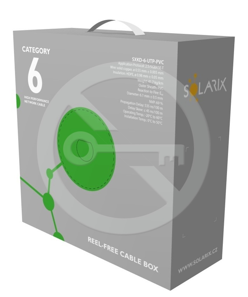 ATTENTION, new 100m box. The Solarix installation cable with the designation SXKD-6-UTP-PVC is a reliable unshielded Category 6 cable designed for Ethernet protocols, including 2.5GBASE-T and 5GBASE-T. The cable construction is U/UTP with a plastic cross, which ensures maximum separation of pairs along the entire length of the cable. The sheath type is PVC with Eca reaction to fire class. The cable conductors are made of high-quality copper wire with a copper purity of 99.97%. The cable easily meets the requirements of international standards ISO/IEC 11801, EN 50173, and ANSI/TIA 568.2-D. In accordance with CPR (EU Regulation No. 305/2011), the cable is tested by the independent laboratory FORCE TECHNOLOGY in the AVCP 3 property assessment system. Like other Solarix cables, the SXKD-6-UTP-PVC cable is marked in 1 m increments from 0 to 100 m. The cable is supplied in a highly durable three-layer polished cardboard box, which contains all the necessary product information, including barcodes, production batch, description, and the most important technical parameters.