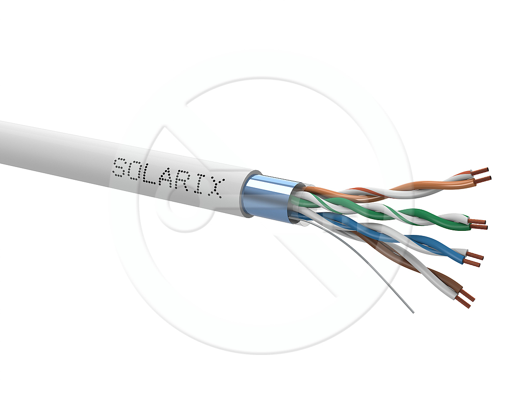 Solarix stranded cables are designed for manufacturing patch cords. Their flexibility is ensured by the fact that individual conductors consist of a stranded wire, which is braided from seven thin copper strands with a diameter of 0.18 mm. The overall conductor size of these Solarix cables is AWG 24. The cables are available in both shielded and unshielded versions. In the case of the FTP cable, the shielding is provided by aluminum foil, and the color of the PVC jacket is gray. The unshielded Solarix stranded cable is also available in gray with a PVC jacket. Due to its properties (primarily higher attenuation), stranded cables are not suitable for horizontal cabling.