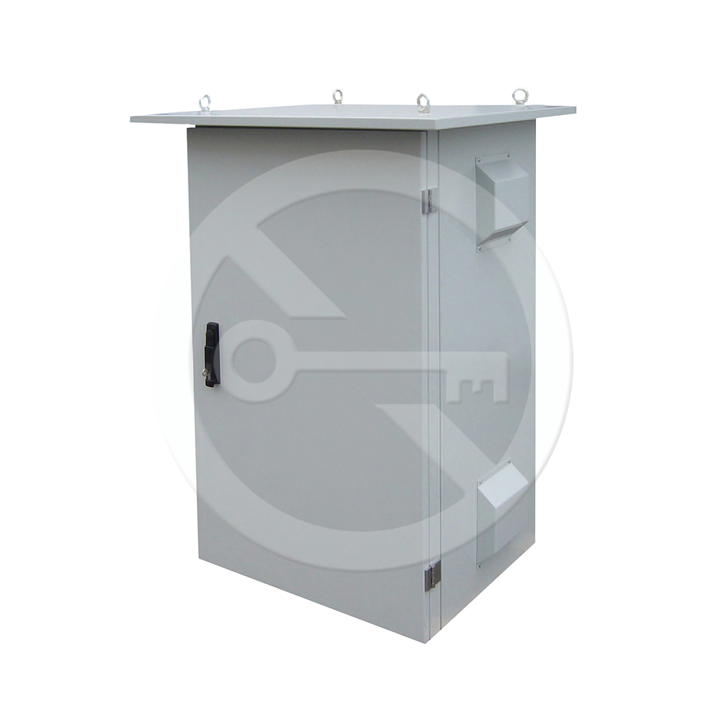 LC-07+ consists of a welded frame forming the shell of the rack. The back side is prepared for mounting the data rack to a wall. From the front side, the rack is fitted with a door with two outer hinges and a key lock with three-point locking. The side covers can be opened from the inside of the data rack. The hinges are made of metal. The side covers can be interchanged in easily. Furthermore, the side cover can be purchased with ventilation adapted to the outside environment. The bottom of the rack is fitted with glands for cables. The rack ceiling is solid. Above the ceiling there is a ceiling cover which serves as a protection against rain and direct sunlight. The LC-07+ data rack also includes four hanging lugs for easy manipulation. The rack includes four 19 inch frames and is thermo-insulated.
