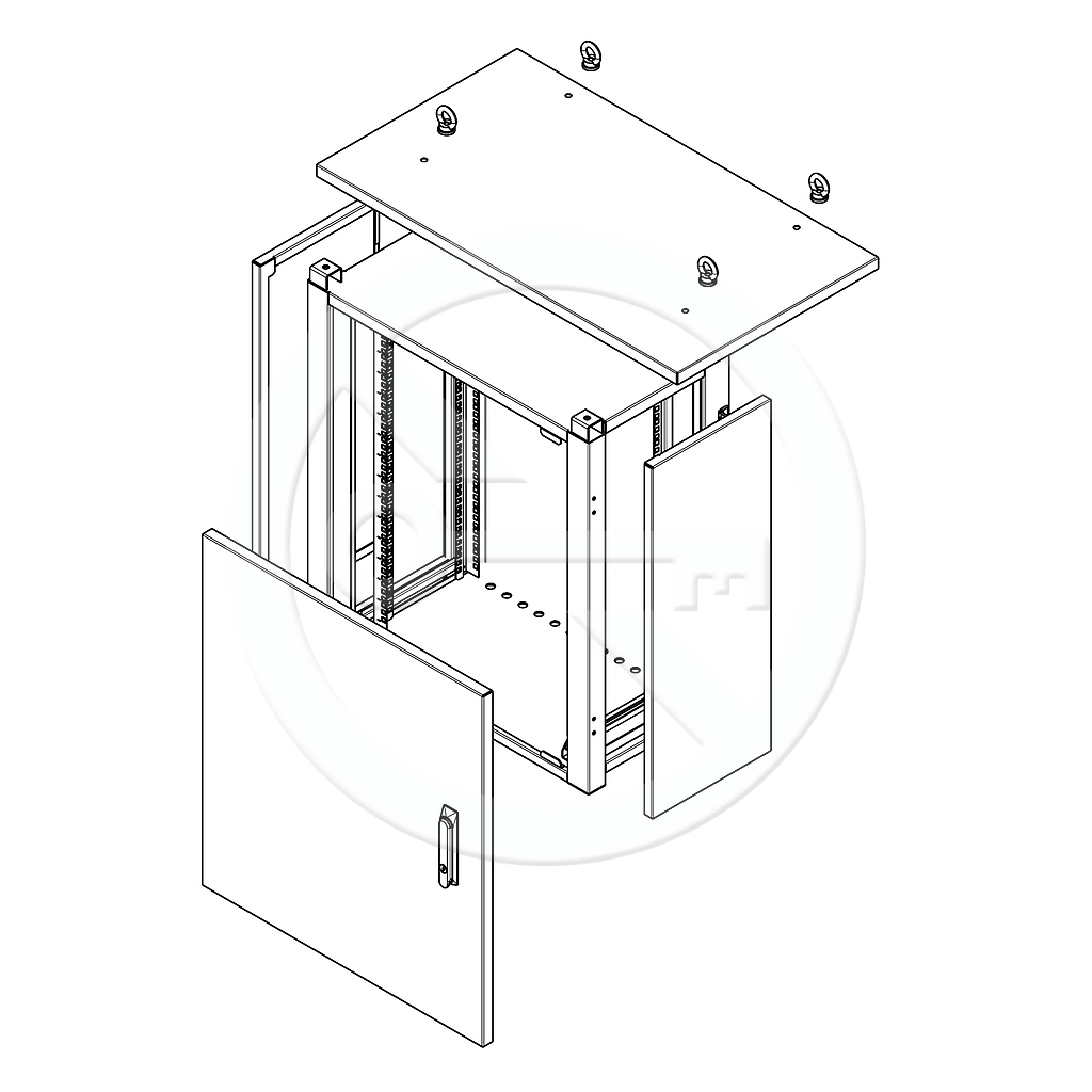 LC-07+ consists of a welded frame forming the shell of the rack. The back side is prepared for mounting the data rack to a wall. From the front side, the rack is fitted with a door with two outer hinges and a key lock with three-point locking. The side covers can be opened from the inside of the data rack. The hinges are made of metal. The side covers can be interchanged in easily. Furthermore, the side cover can be purchased with ventilation adapted to the outside environment. The bottom of the rack is fitted with glands for cables. The rack ceiling is solid. Above the ceiling there is a ceiling cover which serves as a protection against rain and direct sunlight. The LC-07+ data rack also includes four hanging lugs for easy manipulation. The rack includes four 19 inch frames and is thermo-insulated.